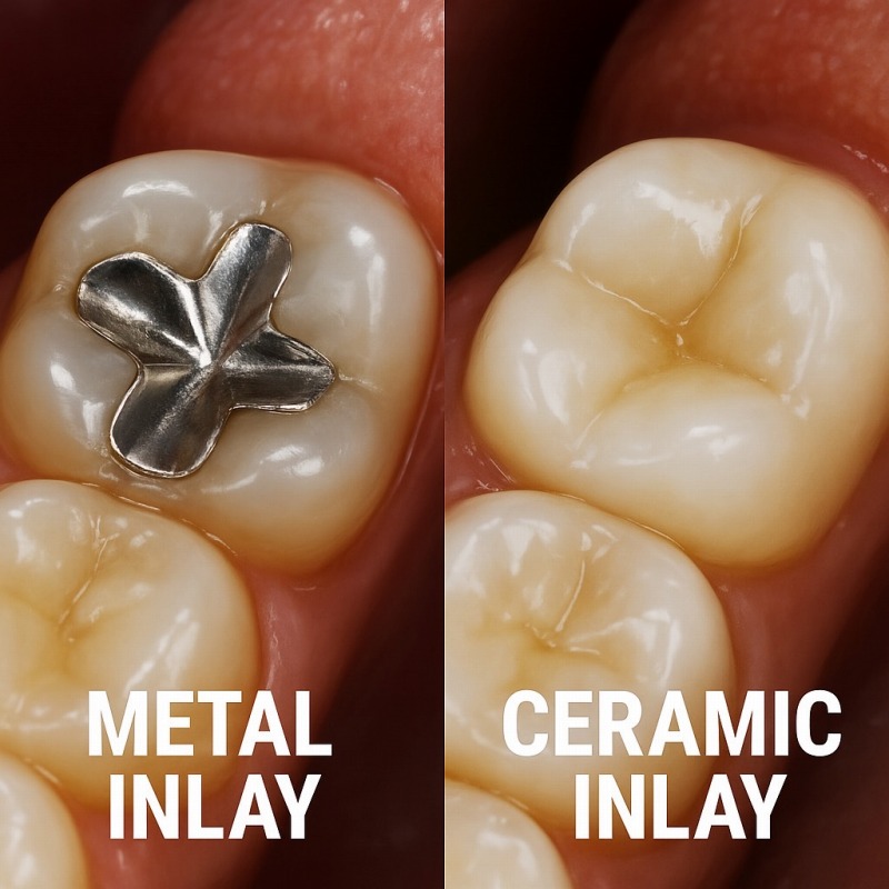 奥歯の場合は強度のかからない部分はコンポジットレジン充填、 強度のかかる部分は金属(健康保険適用)又はセラミック(自由診療)にて型どりの上、製作した充填物を装着します。